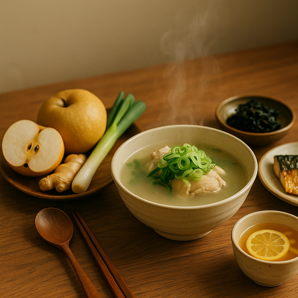 생강·대파·마늘로 따뜻한 국물·차 베이스를 만든다. 배·도라지·유자로 목과 기관지 수분·점액을 보완한다. 발효식품·해조류·버섯·오메가3로 장·면역 루프를 채운다. ✨